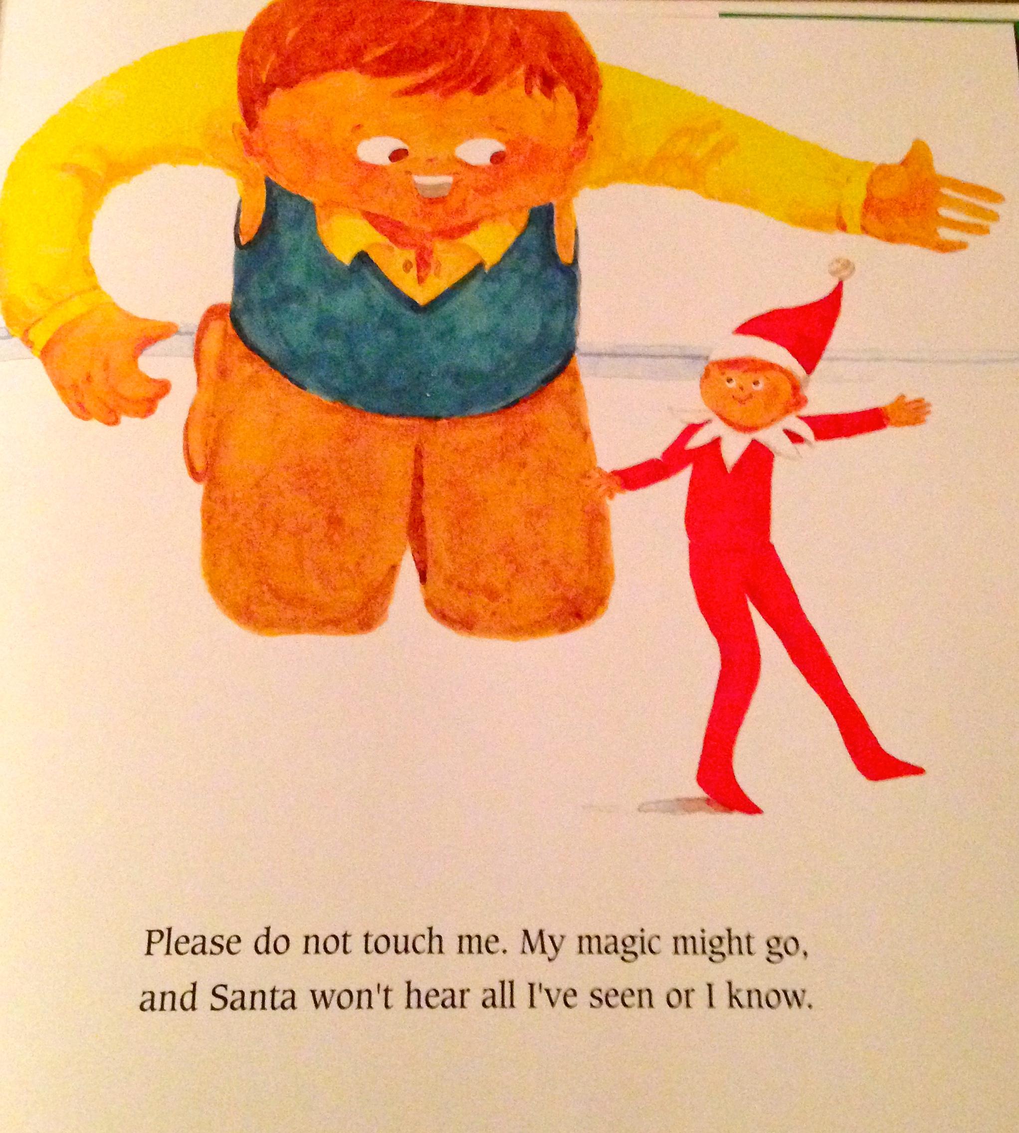 For those of you not familiar with The Elf on the Shelf, it is a book that seeks to explain to children how Santa knows if they are naughty or nice each day. They are watched by their very own elf (spy), who flies back to the North Pole each night to give Santa the report of the day. Each book comes with a creepy little elf that the child is supposed to name and trust; meanwhile, the elf has spent the day spying on the child and watching their every move from whatever creepy perch he was placed in during the night, by the well-meaning parent, for the purpose of collecting information he can use to tattle on them to his boss, Santa Claus.